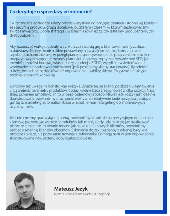Co jest naprawdę ważne kiedy prowadzi się biznes w sieci? Jak być świadomym potencjalnych błędów i unikać potknięć w e-biznesie? Nasi najlepsi eksperci od e-commerce: Mateusz Jeżyk (JU: Agencja), Krzysztof Jagliński (Fast White Cat S.A.), Katarzyna Paprzycka (Fast White Cat S.A.), Jacek Treder (Sales Intelligence S.A.) i Daniel Werner (Digitree Group S.A.) w obszernym artykule, będącym częścią raportu, doradzają kompleksowe podejście do tematu. Startegia komunikacji, odpowiednie oprogramownie czy automatyzacja działań to tylko niektóre z rozwiązań, których połączenie może odpowiadać za sukces naszego biznesu.