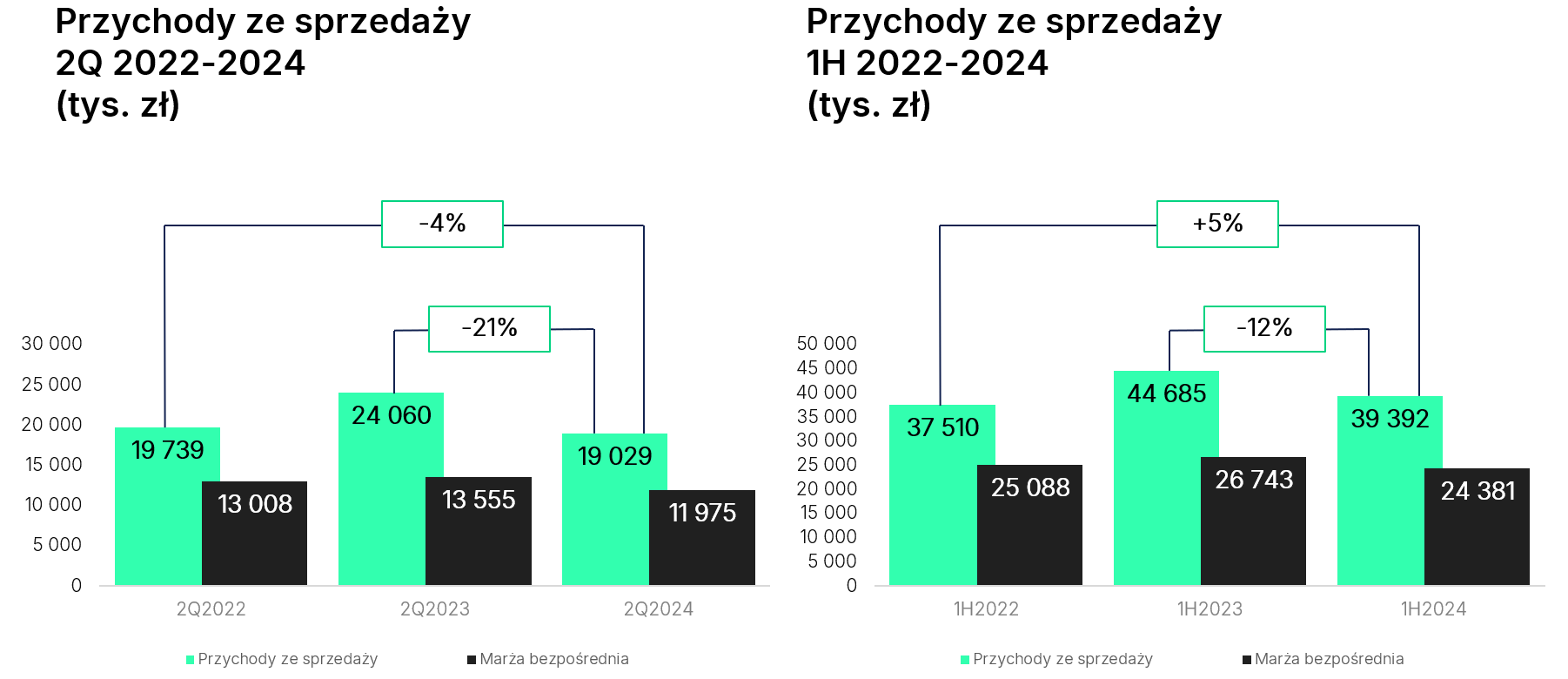 W pierwszej połowie 2024 roku przychody naszej Grupy Kapitałowej wyniosły 39,4 mln zł, co stanowi spadek o 11,8 proc. w porównaniu z pierwszym półroczem 2023 roku. Jednocześnie, wynik ten jest o 5 proc. wyższy niż w analogicznym okresie 2022 roku.
