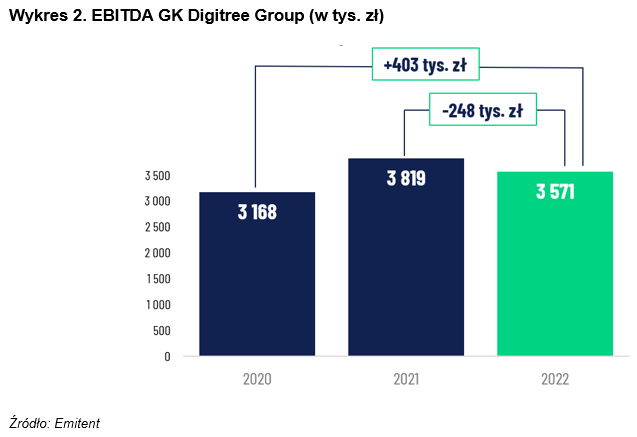 Skonsolidowane przychody Grupy Kapitałowej Digitree Group w czwartym kwartale 2022 roku wyniosły 22 983 tys. zł i były wyższe od wypracowanych w czwartym kwartale 2021 roku o 4 635 tys. zł, tj. o ponad 25 proc. oraz wyższe od przychodów osiągniętych w pozostałych kwartałach 2022 roku. Grupa w czwartym kwartale 2022 roku osiągnęła zysk netto na poziomie 287 tys. zł w porównaniu 57 tys. zł straty w tym samym okresie 2021 roku oraz 888 tys. zł straty w 2020 roku.