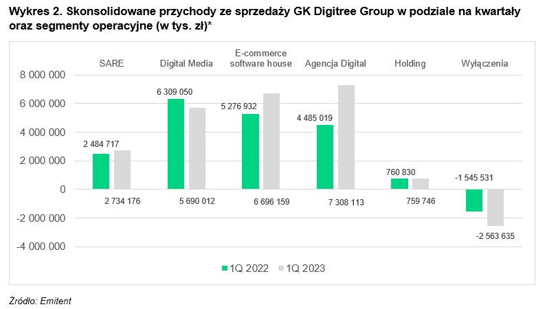 Skonsolidowane przychody Grupy Kapitałowej Digitree Group zwiększyły się w pierwszym kwartale 2023 roku o blisko 2,9 mln zł osiągając rekordowy, pod względem pierwszego kwartału, poziom 20,6 mln zł. To wzrost o ponad 16 proc. w porównaniu do analogicznego okresu ubiegłego roku. Wzrost przychodów został wypracowany głównie w segmencie Agencja Digital. Strata netto wyniosła 0,82 mln zł, wobec straty sięgającej bisko 0,79 mln zł w I kwartale 2022 roku. EBITDA w pierwszym kwartale br. wyniosła w przybliżeniu 486 tys. zł, wobec 392 tys. zł w analogicznym okresie poprzedniego roku.