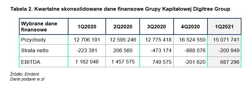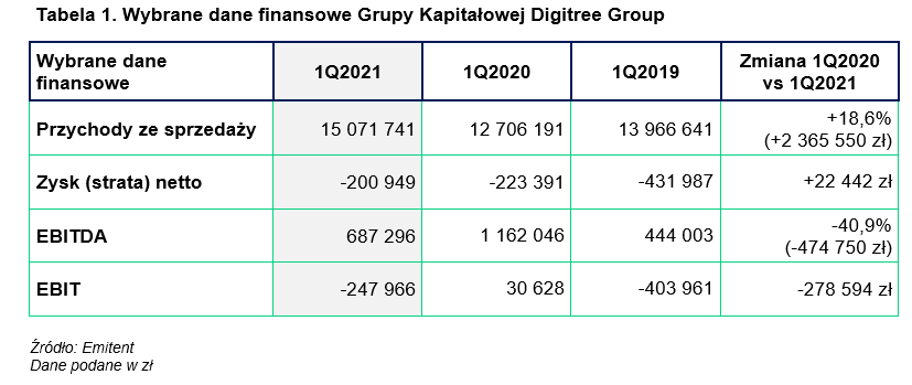 Skonsolidowane przychody Grupy Kapitałowej Digitree Group zwiększyły się o 2,4 mln zł, osiągając w pierwszym kwartale 2021 roku rekordowy poziom 15,1 mln zł. 19-proc. wzrost przychodów został wypracowany w szczególności w segmencie Enterprise – na produktach wdrożeniowych, a także w segmencie E-commerce 360, które stanowią jedne z filarów nowej strategii Grupy, przyjętej w styczniu. Wysoki poziom sprzedaży w pierwszych miesiącach br. jest kontynuacją czwartego kwartału 2020 roku, kiedy Grupa wygenerowała rekordowe przychody na poziomie 16,5 mln zł.